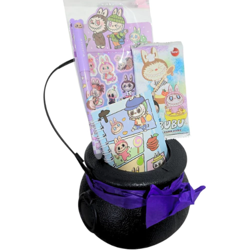 Cada calderito incluye una plancha de stickers, una mini libreta, una lapicera y un sobrecito sorpresa con cartas holográficas, todo diseñado con motivos encantadores de Kuromi y Labubu. Olvidate del miedo y dale la bienvenida a la alegría y la creatividad.